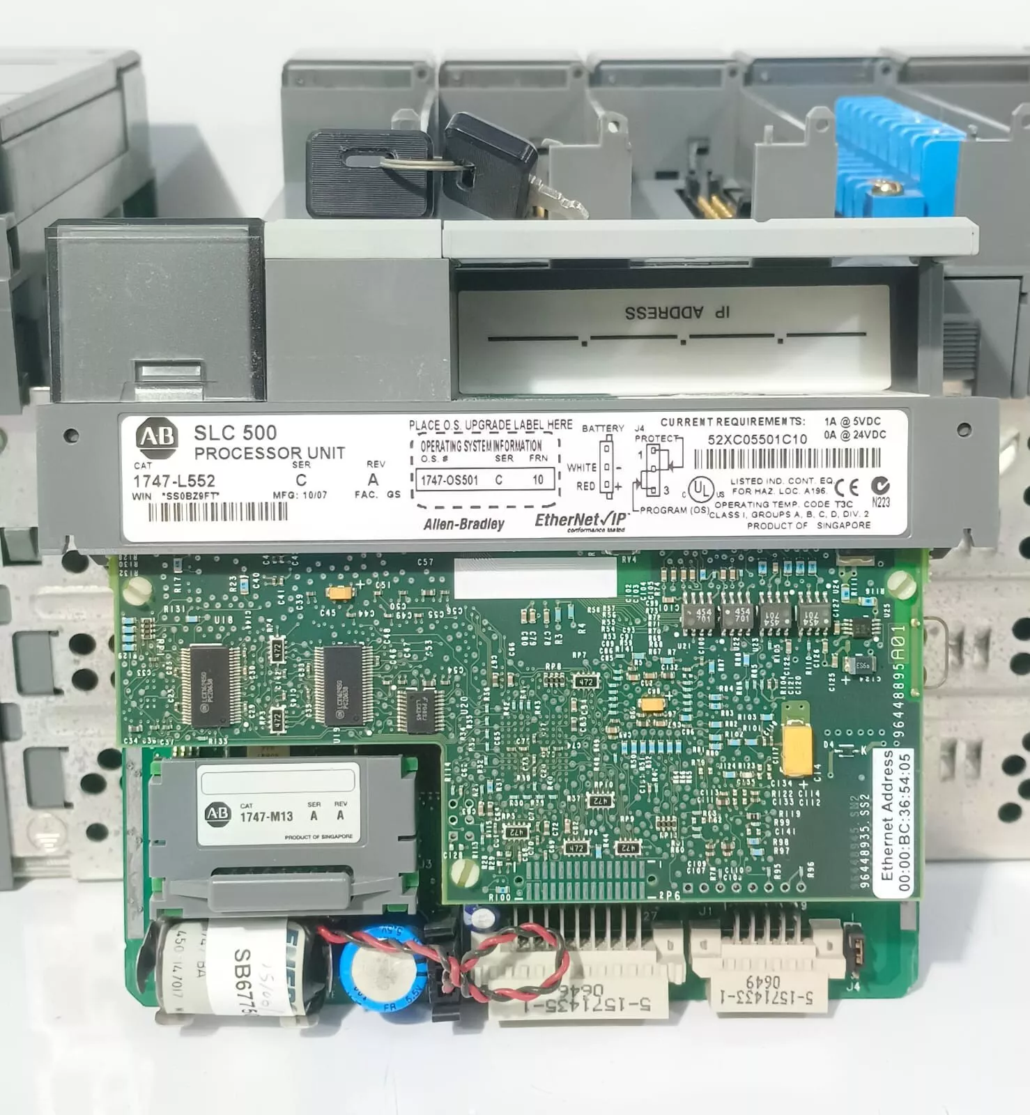 This Allen-Bradley 1747-L552 SER C is a high-performance SLC 5/05 32K Controller, part of the SLC 500 series, designed for industrial automation and control applications. It includes a 1747-M13/A Memory Module for enhanced data processing.