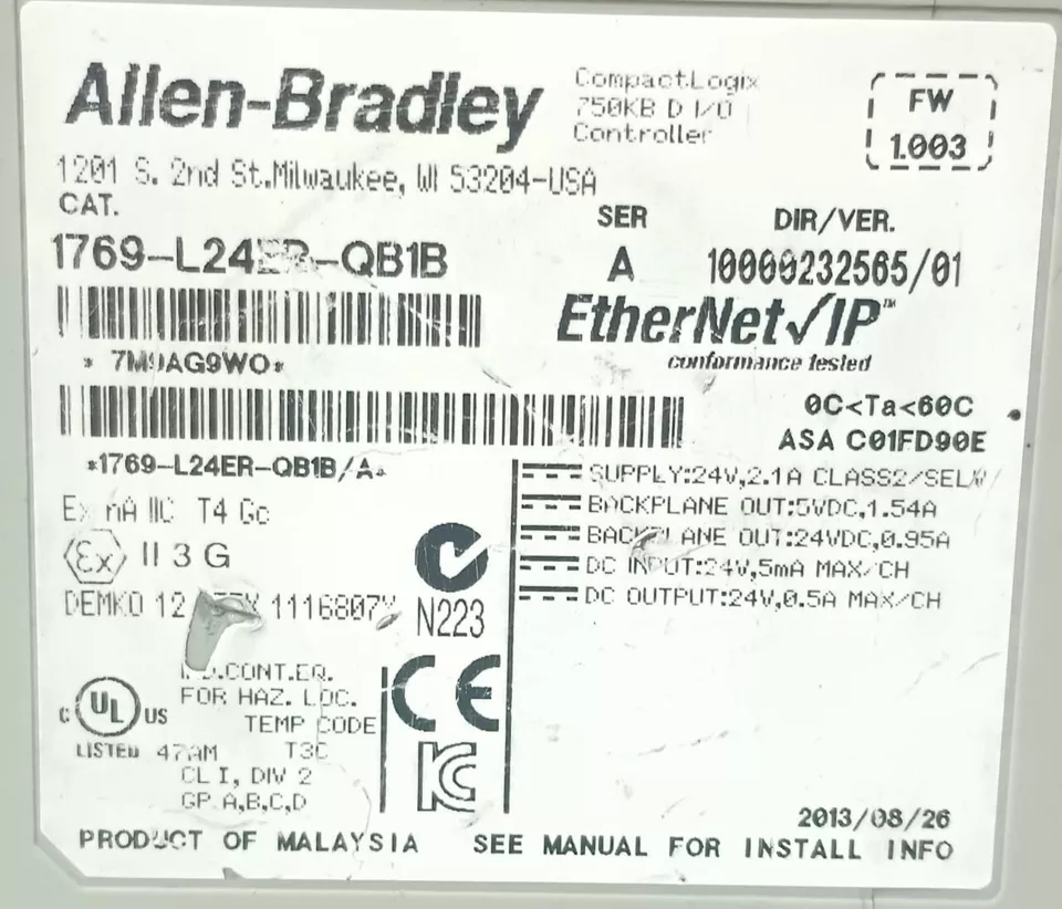Allen Bradley 1769-L24ER-QB1B CompactLogix 5370 ENet Controller – 24V, 2.1A, 750KB I/O, Used, Made in Malaysia
