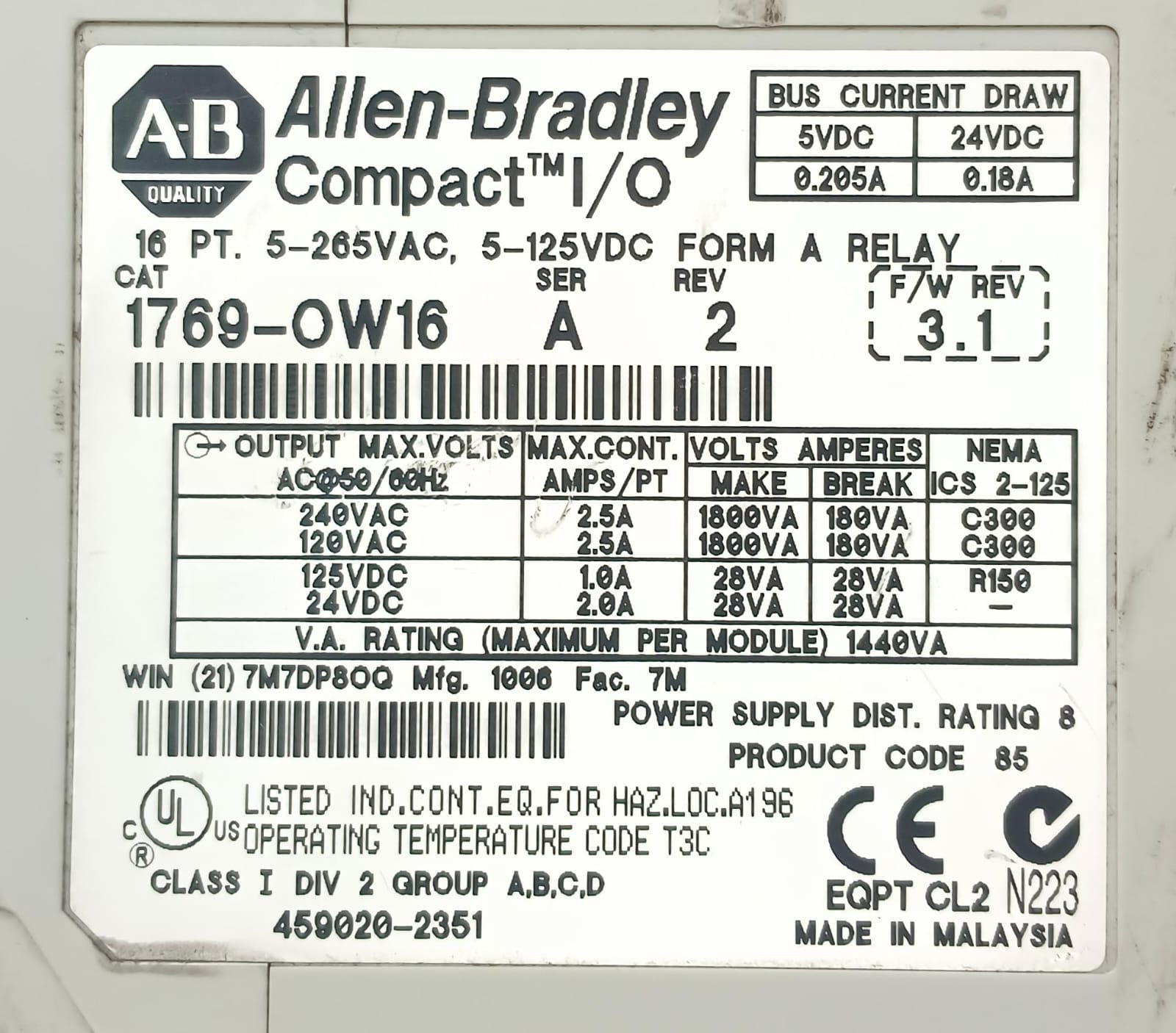 Allen-Bradley 1769-OW16, ser/A Compact I/O CompactLogix 16 Pt D/O Relay Module _ Used